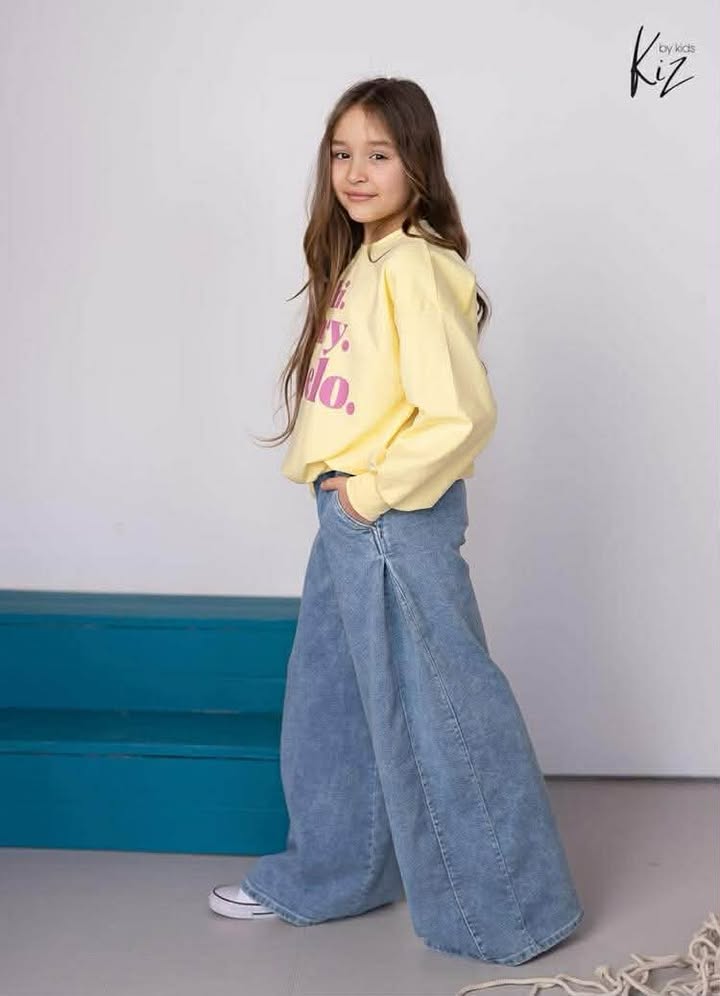 Bluza dziecięca w delikatnym, pastelowym odcieniu żółci to idealna propozycja na co dzień. Na przodzie znajduje się wyrazisty, różowy napis „hi. hey. hello.”, który dodaje stylizacji dziewczęcego uroku i modnego charakteru.