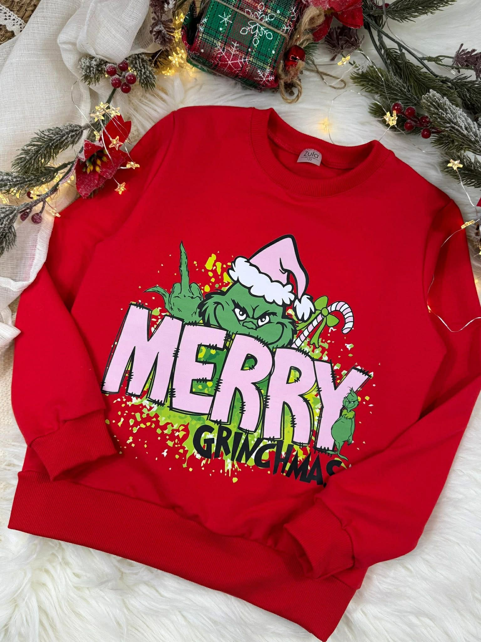 Wyjątkowa czerwona bluza z motywem Grincha to idealny wybór na świąteczny czas dla mamy czy taty i córki czy synka. A może cała rodzinna ekipa? Uroczy, kolorowy nadruk wprowadza bożonarodzeniowy klimat i sprawia, że ten zestaw przyciąga spojrzenia oraz wywołuje uśmiech. Od razu przypomina się z bajką czy filmem z zieloną postacią w tle.