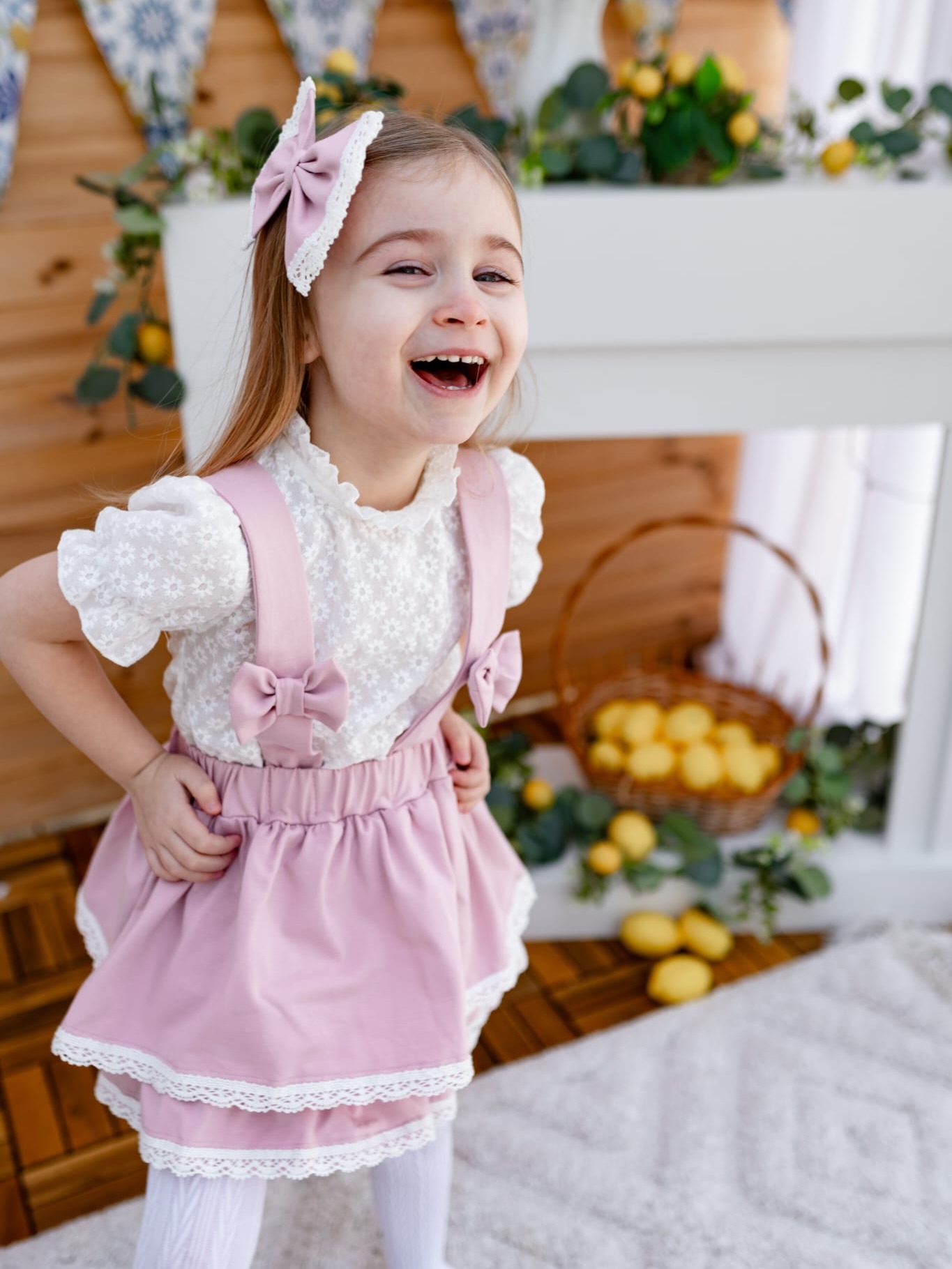 Urocza i niezwykle dziewczęca spódniczka na szelkach w odcieniu pudrowego różu to idealna propozycja dla małych miłośniczek stylowych stylizacji. Delikatny kolor w połączeniu z ozdobnymi kokardami nadaje całości subtelnego, romantycznego charakteru.