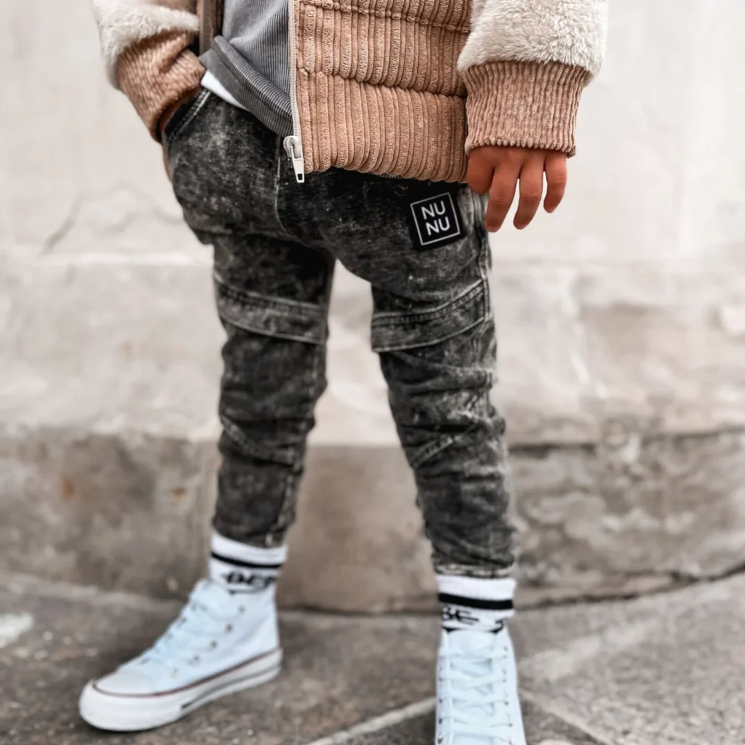 Stylowe dzwony dziecięce w modnym odcieniu spranego denimu to połączenie wyglądu jeansów z wygodą elastycznych spodni. Charakterystyczne przeszycia na nogawkach nadają im oryginalny, nowoczesny wygląd, a miękki i elastyczny materiał gwarantuje pełną swobodę ruchów. Idealne na co dzień – do szkoły, przedszkola czy na spacer. Wykończone elastycznymi ściągaczami przy kostkach z efektowną naszywką „NU NU”,…